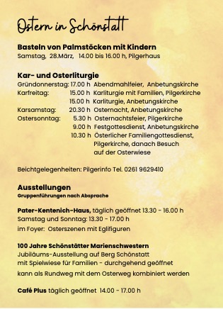 Er bietet eine sehr familienfreundliche und spirituell dichte Erfahrung rund um die Kar- und Ostertage. Die Angebote reichen von interaktiven Stationen in der Natur über kreative Elemente bis hin zu Osterleckereien. Ostern bewusst und doch irgendwie einmal anders erleben, das wird auf Berg Schönstatt möglich.